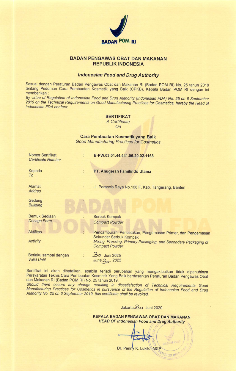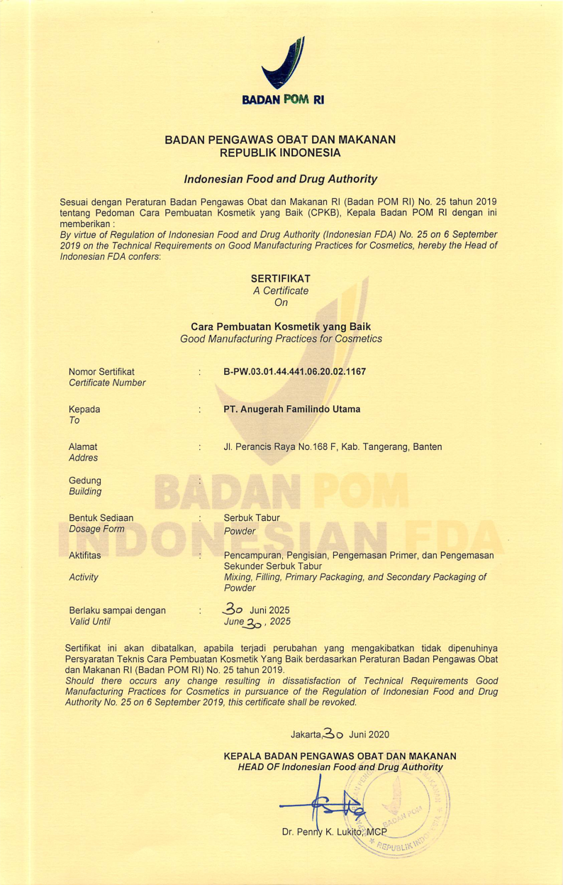 Sertifikat Cara Pembuatan Kosmetik yang Baik untuk Sediaan Serbuk Tabur